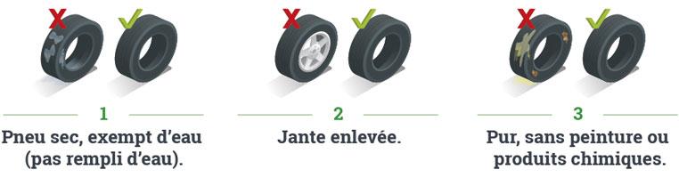 - Seuls les pneus propres et exempts de peinture ou autres produits chimiques sont acceptés.